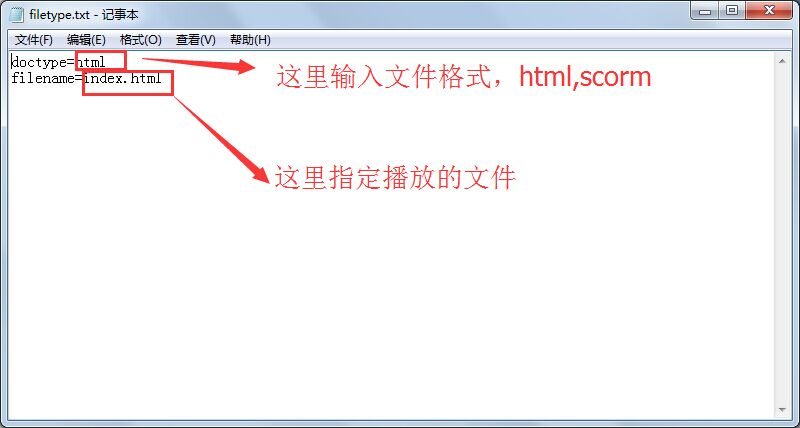 2、filetype.txt里添加doctype指定上傳的格式,只能是html或者scorm,以及播放的文件filename,具體如下圖